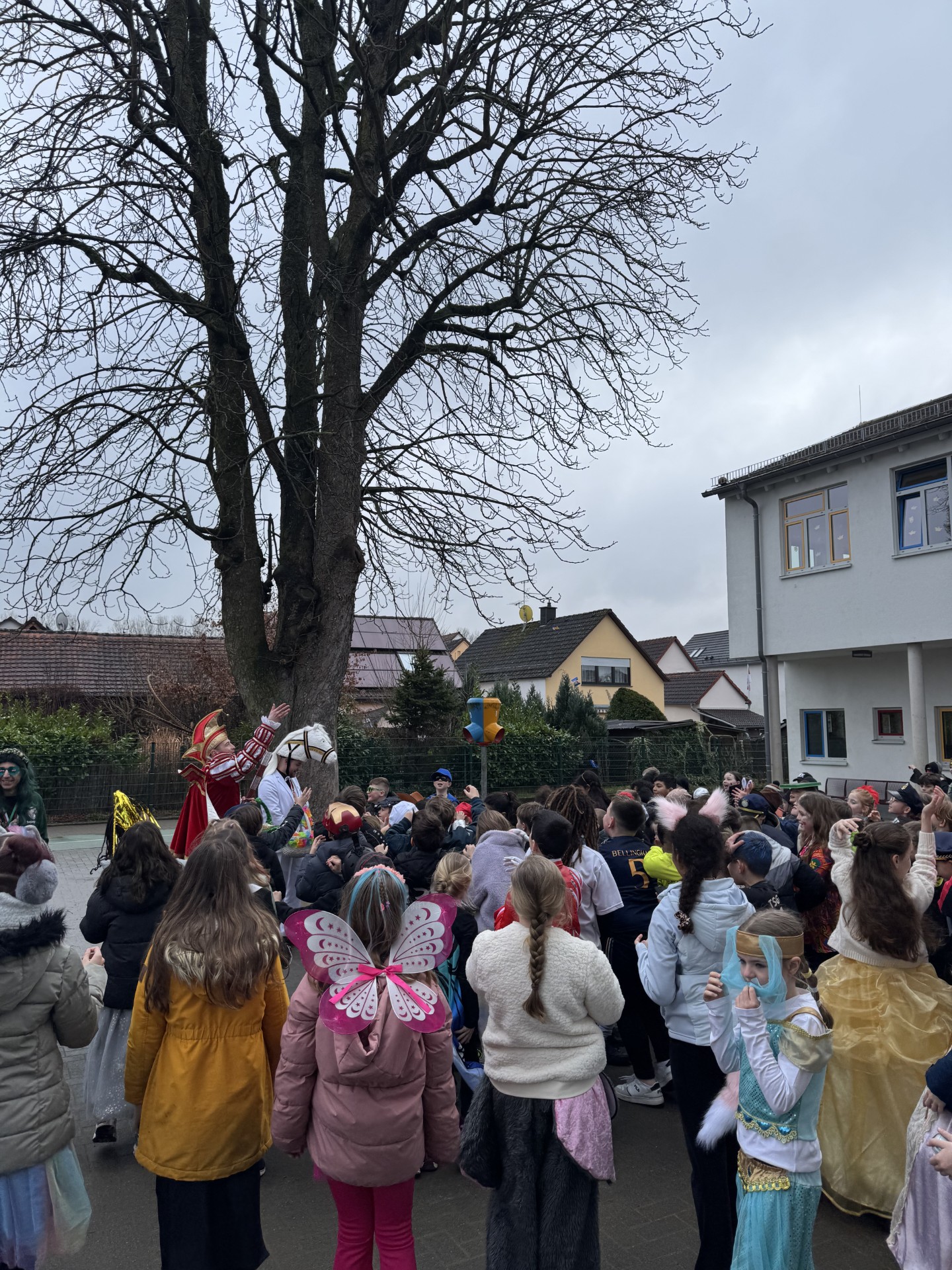 Am Faschingsfreitag war viel los auf unserem Schulhof. Frau Völker holte alle Kinder mit einer Polonaise aus ihren Klassenräumen ab und führte sie auf den Pausenhof, um das Mainflinger Dreigestirn in Empfang zu nehmen. Nach ein paar Worten unserer stv. Schulleiterin Frau Völker, der Fastnachtsbeauftragten Frau Rauh und Schimmel Yannik I. wurde noch gemeinsam gesungen, getanzt und Süßes ausgeworfen. Mit einer Polonaise über den Schulhof und lauter Faschingsmusik verabschiedete sich das Dreigestirn.