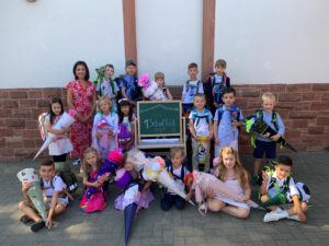 Am Dienstag, den 19.8.25, begrüßte Frau Völker als Konrektorin der Anna-Freud-Schule in jeweils einer separaten Einschulungsfeier im Bürgerhaus drei neue erste Klassen. Zahlreiche Eltern, der Bürgermeister Frank Simon und Thomas Weil von der Kinderhilfegruppe ANWR erschienen zur Einschulungsfeier. Die Kinder freuten sich sehr über das von Herrn Simon überreichte AFS-T-Shirt und die Sicherheitsweste und ein Blinklicht für den Ranzen, die von Herrn Weil übergeben wurden. Nach einer gemeinsamen Feier mit einer Lied- und Tanzaufführung der Klassen 2a und 2c und einem kleinen Theaterstück „Die Wunschmaschine“ der Klasse 2c durften die Kinder das erste Mal Klassenraumluft schnuppern, während ihre Eltern bei strahlendem Sonnenschein von den Eltern unserer zweiten Klassen auf dem Pausenhof bewirtet wurden.