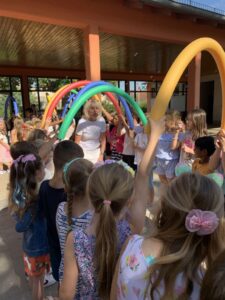 Die Schüler:innen ernteten viel Applaus und viele Lacher für die wundervollen Darbietungen. Im Anschluss überreichten die Klassensprecher:innen Frau Schneider jeweils ein großes Puzzleteil mit einem persönlichen Abschiedssatz. Nach den tränenreichen und sehr emotionalen Abschiedsworten von Frau Schneider legte jede:r Schüler:in ihr noch ein Minischokoladentäfelchen, mit dem eigenen Namen versehen, in einen riesigen, gemeinsam gebastelten High-Heel.