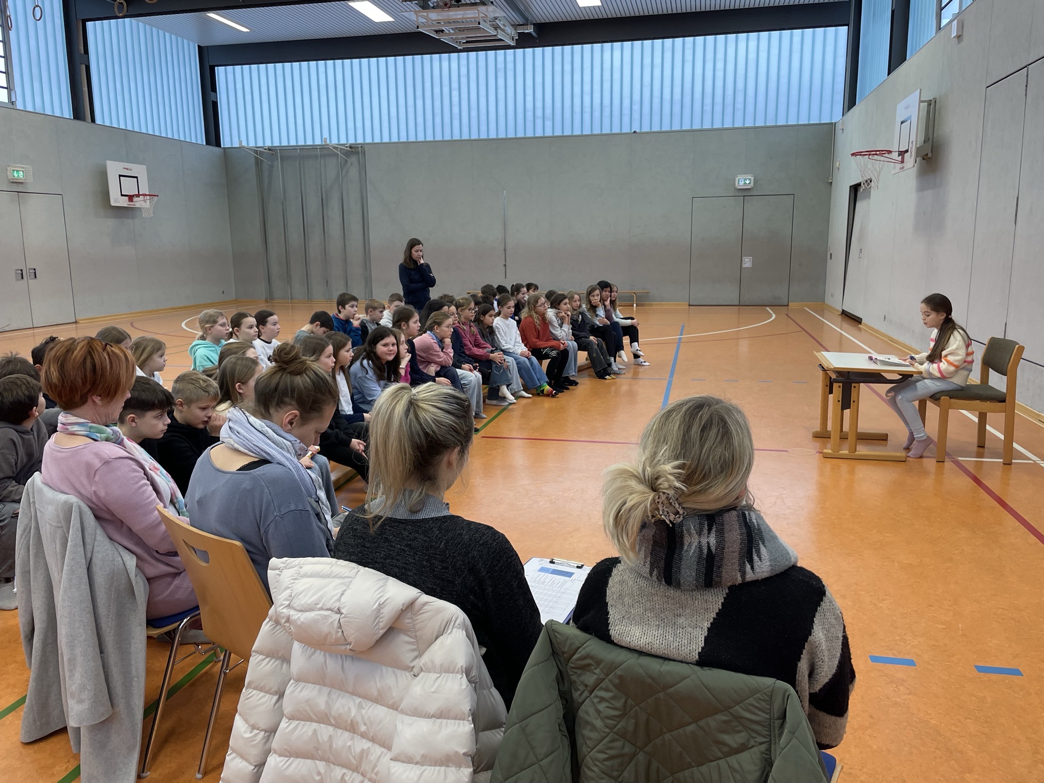 Am 24.2.26 in der 2. Stunde fand in unserer Turnhalle ein besonderes Ereignis statt: Der Schulentscheid für den Vorlesewettbewerb der 4. Klassen.